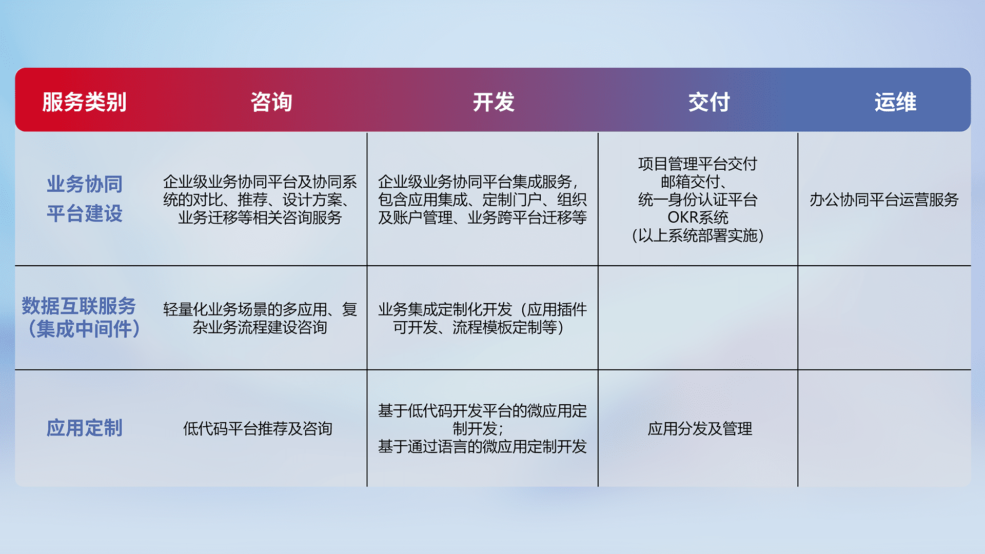 针对钉钉、、、企微、、、、IDaas等平台级产品提供产品的规划、、方案、、交付、、、定制化开发等服务,,,,实现如统一协同办公、、、智能客户服务、、、混合会议管理、、智能数据查询、、、、等业务场景,,实现数字化转型。。。。